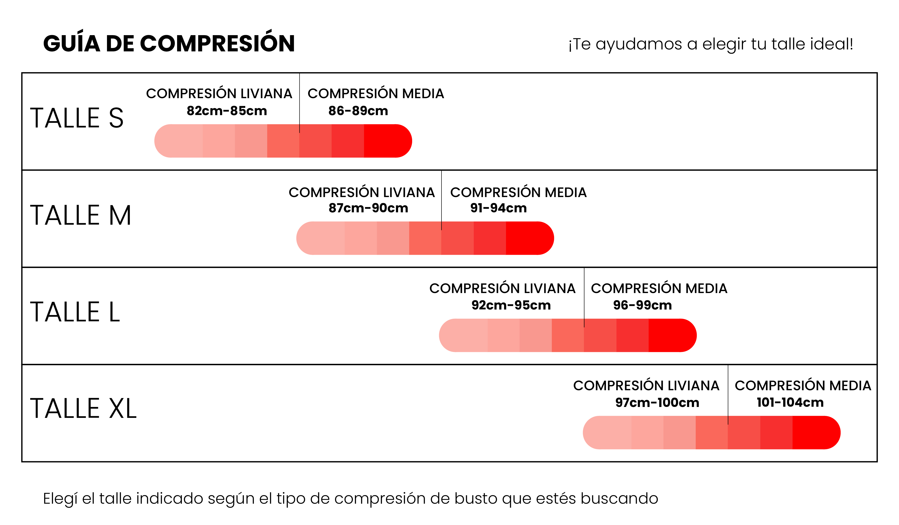 También te brindamos esta tabla de compresión para que puedas elegir el talle correcto en el caso de que quieras llevar uno de nuestros corpiños segunda piel.